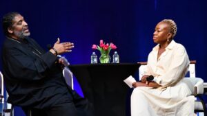 Senior Media, Journalism and Film (MJFC) student interviewer Nayo Campbell, listens as Cathy Hughes responds to question from audience.