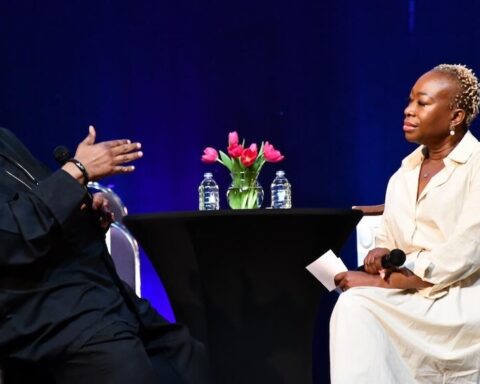 Senior Media, Journalism and Film (MJFC) student interviewer Nayo Campbell, listens as Cathy Hughes responds to question from audience.
