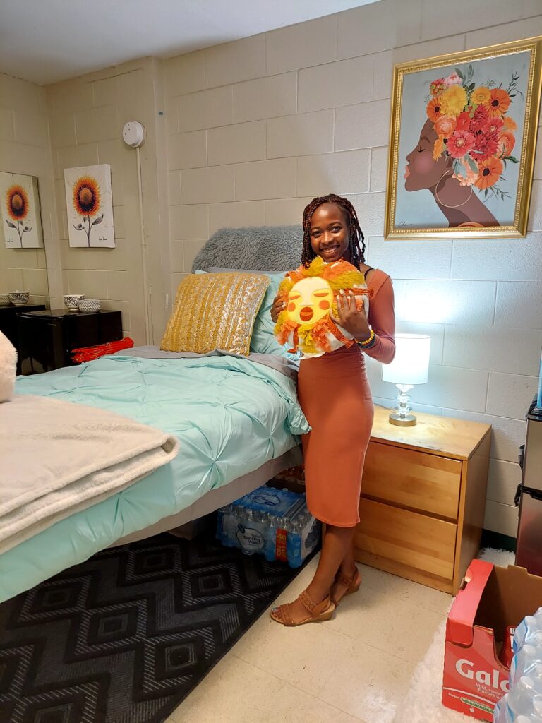 Juliet Alozie smiles for a photo in her newly decorated dorm room at Fisk University. (Photo courtesy of LaTerra Wise)