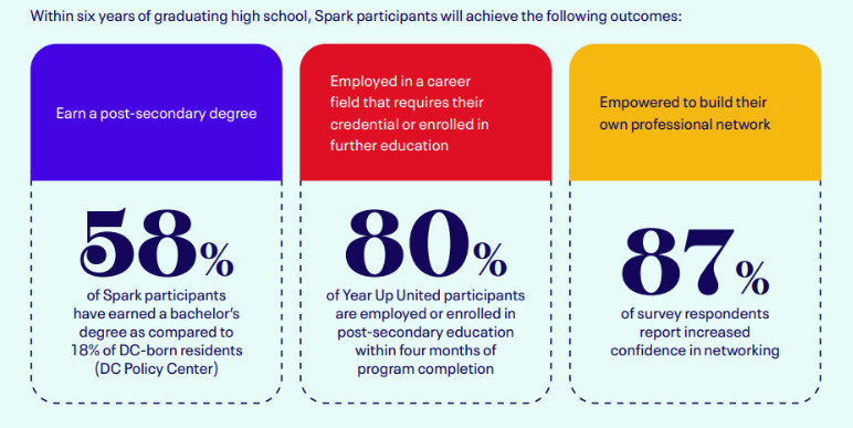 Each organization contributes to a different stage of the journey. A student might begin with mentorship through Spark, move into career readiness or academic support through another partner and then enter technical training or an internship program through organizations like Year Up United or Per Scholas.